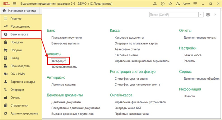 В меню «Банк и касса» выбирается подменю «Финансы» — строка «1С:Кредит» (рис. 1).