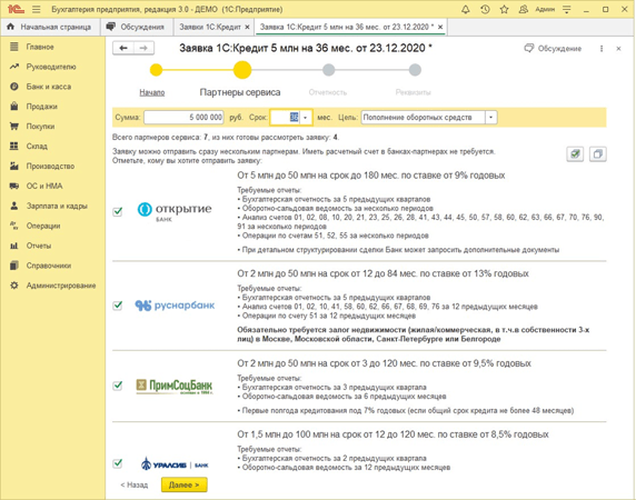 Прямо в программе 1С бухгалтер или руководитель может выбрать наиболее подходящее предложение по кредиту от банка-партнера. Не возникает необходимости согласовывать с кредитным учреждением перечень документов, пакет формируется прямо в программе вместе с заявкой, именно исходя из запроса того банка, куда она направляется.