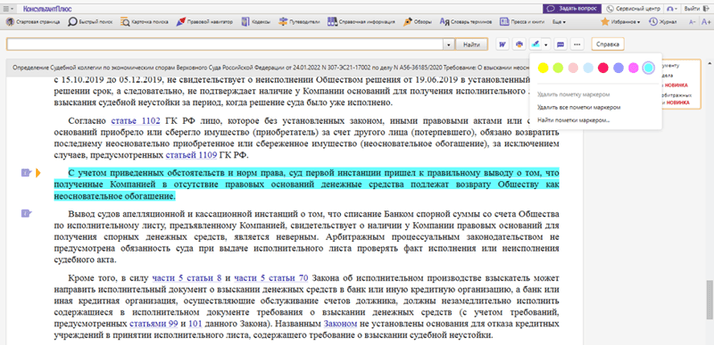 В КонсультантПлюс маркеры аналогичны тем, которые мы с вами использовали на бумаге. Любой текст документа в КонсультантПлюс можно пометить маркером, причем разных цветов. Эта возможность крайне актуальна при работе, скажем, с большим судебным решением, поскольку помогает выделить важные места в документе, нужные формулировки и выводы суда. А в будущем, открыв такой документ с пометками, сразу можно переходить к его сути.