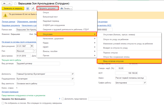 Для внесения информации остатков отпусков и настройки прав на различные виды отпуска непосредственно сотруднику, необходимо перейти в его карточку. Для этого последовательно кликаем по кнопкам «Оформить документ»-«Отсутствия»-«Ввод остатков отпусков». В открывшемся окне можно добавить необходимую информацию и настроить права.