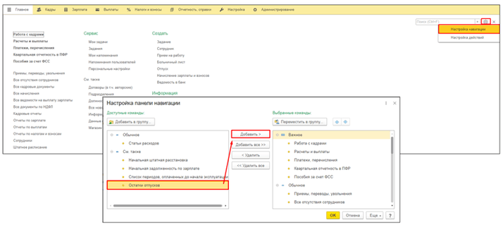 2. Если в колонке «См.также» у вас нет ссылки «Остатки отпусков», предварительно ее нужно сюда добавить. Для этого в правом верхнем углу кликаем на значок шестеренки и нажимаем кнопку «Настройки навигации». В открывшемся окне в левой части таблицы находим «Остатки отпусков», выбираем их и нажимаем кнопку «Добавить», после чего они добавятся в правую часть таблицы. При желании можно использовать голубые стрелки, чтобы переместить раздел в нужное место. Нажимаем «ОК». В результате в разделе «Главное» появится ссылка «Остатки отпусков».