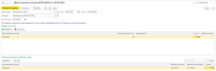 В результате, перейдя по ссылке «Остатки отпусков», по кнопке «Создать» можно ввести как право на отпуск, так и оставшиеся дни по рабочим годам.