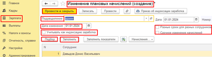 Данный документ позволяет не только назначать разные начисления, но и устанавливать разные сроки плановых начислений для разных сотрудников, также им можно провести индексацию заработка.
