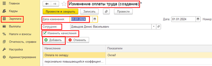 1. Открываем раздел Зарплата-Изменение оплаты сотрудников.