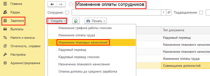 Найти документ Изменение плановых начислений можно через раздел Зарплата — Изменение оплаты сотрудников –Изменение плановых начислений.