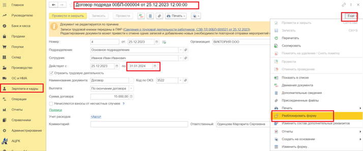 Когда согласно с договором ГПХ будут представлены в СФР данные о начале его действия, тогда данный документ будет заблокирован. В случае необходимости внести изменения в этот документ, в связи с досрочным окончанием договора, в программе 1С: Предприятие 8.3 следует выполнить следующие шаги: