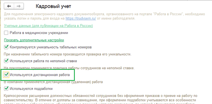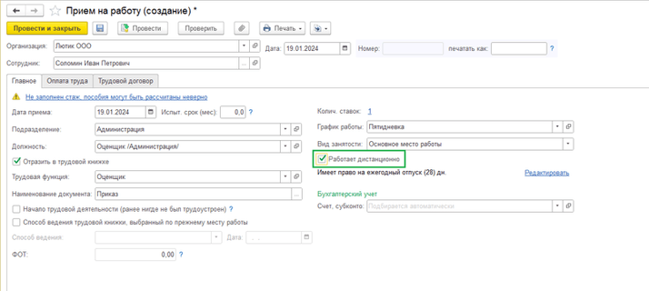 Далее в кадровых документах «Прием на работу» и «Кадровый перевод» появится новый флажок для указания признака удаленной работы «Работает дистанционно».