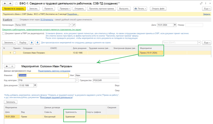 В отчете ЕФС: Сведения о трудовой деятельности работников, СЗВ-ТД в табличной части мероприятия появиться запись «Удаленная».