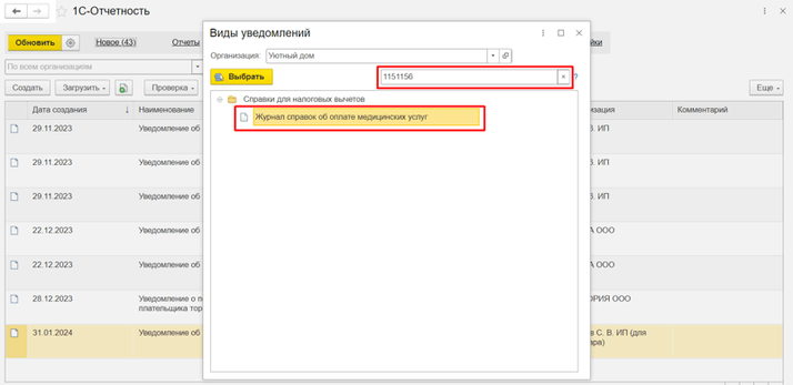 Справка об оплате медицинских услуг для представления в налоговый орган доступна с релиза 3.0.137 ее можно найти в «Отчеты» — «Уведомления, сообщения и заявления» — «Создать» — в строке поиска указать номер по КНД — 1151156.
