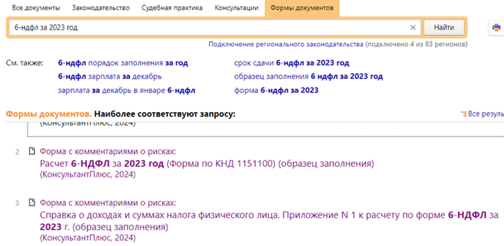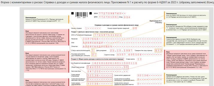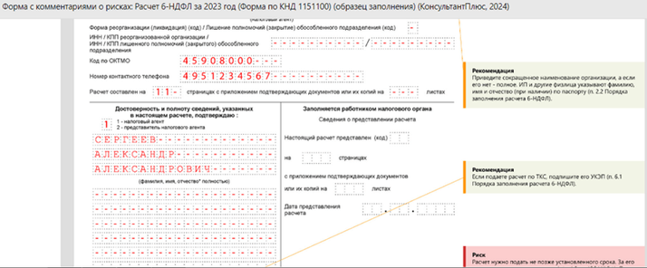 Расчет 6-НДФЛ за 2023 год подают не позднее 26 февраля 2024 года. Вопросов по его заполнению может возникать множество. Расчет за год усложняется заполнением справки о доходах и суммах налога физического лица. Их и найдем. Достаточно ввести запрос — и форма с комментариями о рисках перед нами.
