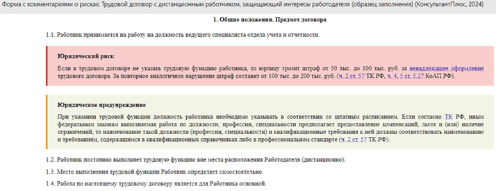 В этом случае важные комментарии о рисках и предупреждениях находятся между текстом. Перед нами не просто шаблон, а трудовой договор, защищающий интересы работодателя.