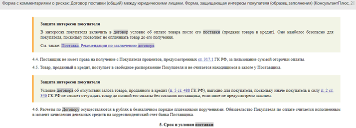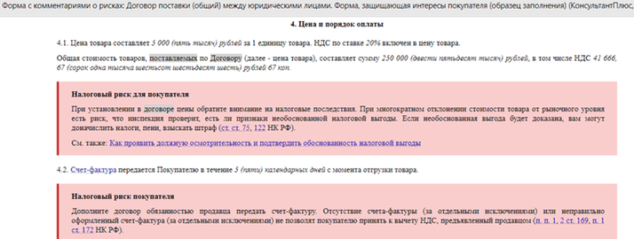 Перед нами форма, защищающая интересы покупателя. Мы видим между текстом соответствующие пояснения. Обратите внимание, образец сопровождается информацией о налоговых рисках.