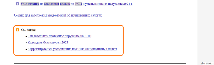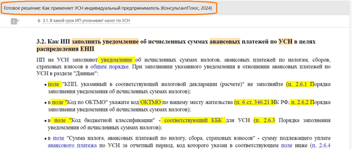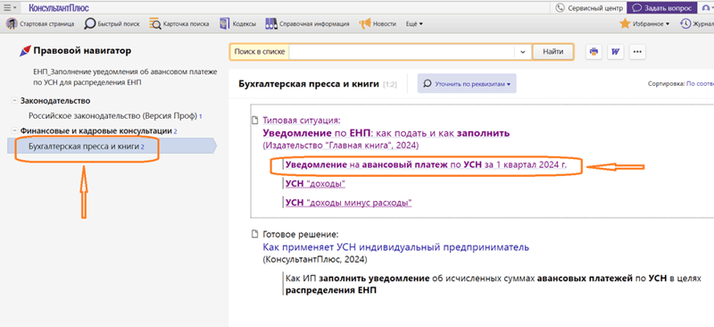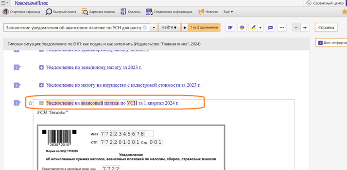 Далее откройте «Типовую ситуацию» сразу со строчки «Уведомление на авансовый платеж по УСН за I квартал 2024 г.». Система направит вас в документ сразу в нужной позиции.