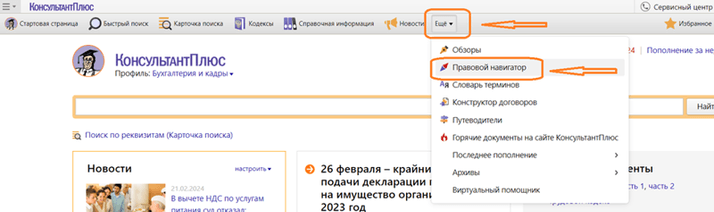 Затем откройте правовой навигатор. Для этого нажмите «Еще» на панели инструментов, в открывшемся списке — «Правовой навигатор».
