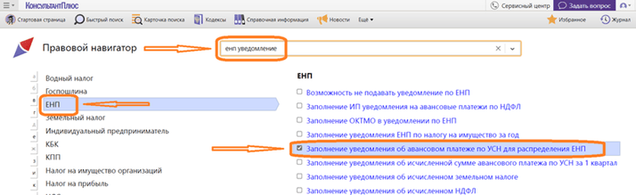 Для того,ю чтобы задать запрос, введите в поисковую строку два-три ключевых слова по вашей задаче. К примеру, задайте запрос в поисковой строке «ЕНП уведомление». В левой части таблицы построятся группы понятий, в которых есть ситуации, относящиеся к сути вопроса. В правой части — ситуации из активной группы. Выберите в левой части группу «ЕНП», в правой части – строку «Заполнение уведомления об авансовом платеже по УСН для распределения ЕНП».