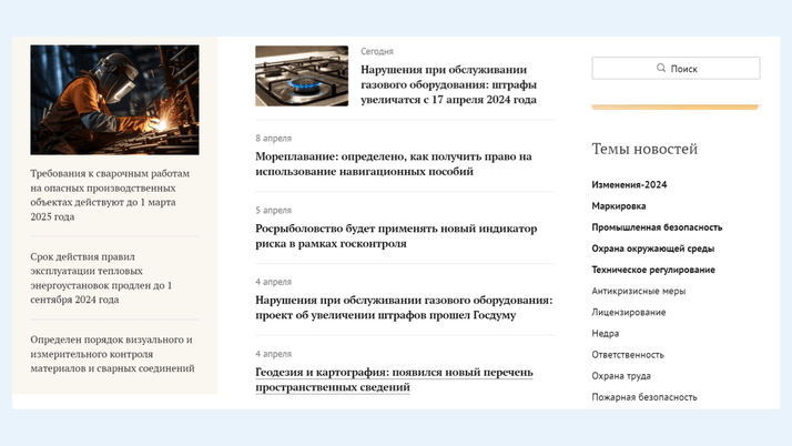 Профиль дает быстрый доступ к ключевым законам, техстандартам, нормам и правилам по промышленной безопасности, СанПиНам, ГОСТам и другому полезному контенту. Все изменения в сфере технического регулирования, важные разъяснения ведомств и судов сразу появляются в новостях.