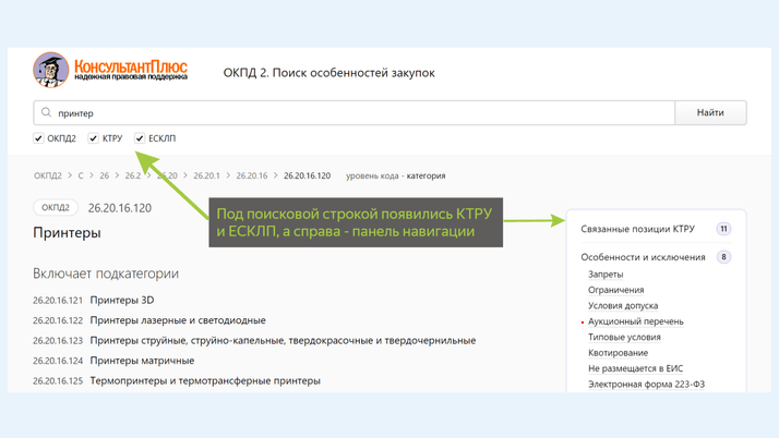 В сервисе «ОКПД 2. Поиск особенностей закупок» теперь есть КТРУ и ЕСКЛП