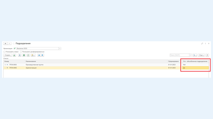 После настройки формы в справочнике «Подразделения» появится новая колонка: