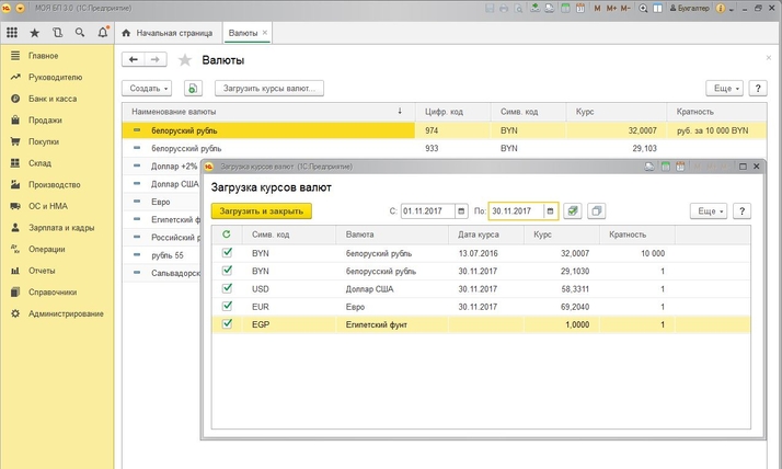 Меню: справочники – раздел «Покупки и продажи» – «Валюты». Выбираем «Загрузить курсы валют». В первую очередь устанавливаем период загрузки. Ставим отметку напротив необходимой валюты (например: USD, EUR, BYN и т. д.), затем нажимаем «Загрузить и закрыть» и добавляем валюты в справочник.