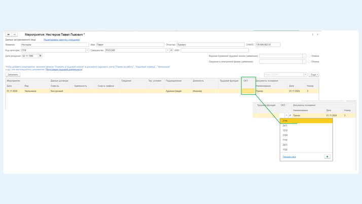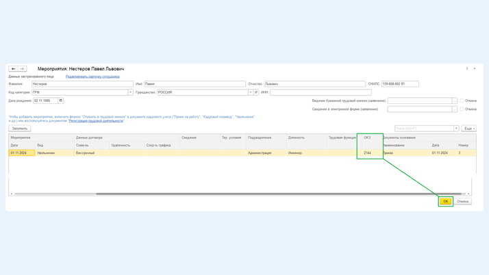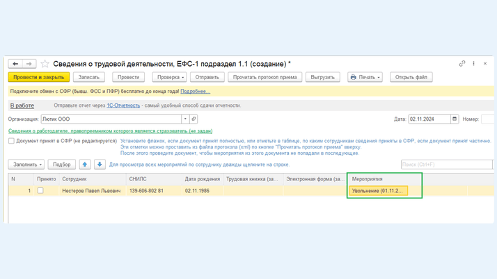 Для того чтобы в отчете «Сведения о трудовой деятельности, ЕФС-1 подраздел 1.1» по мероприятию «Увольнение» сотрудника, принятого до 2021 года, заполнить код ОКЗ, необходимо в форме отчета расшифровать колонку «Мероприятие».