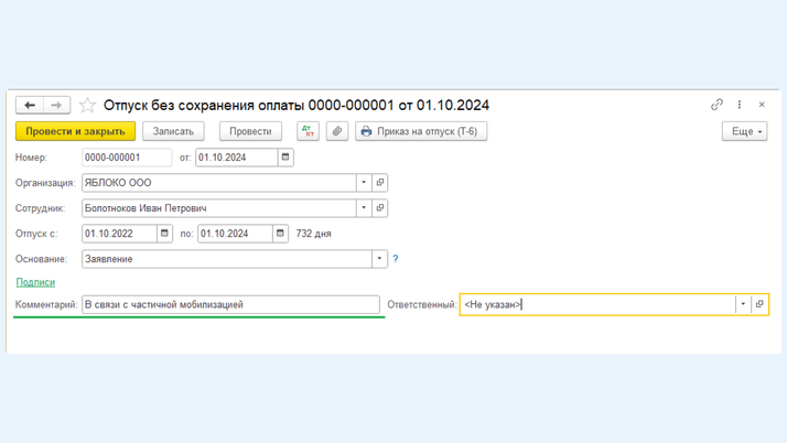 Если период отсутствия неизвестен, целесообразно создавать документ ежемесячно, по необходимости.