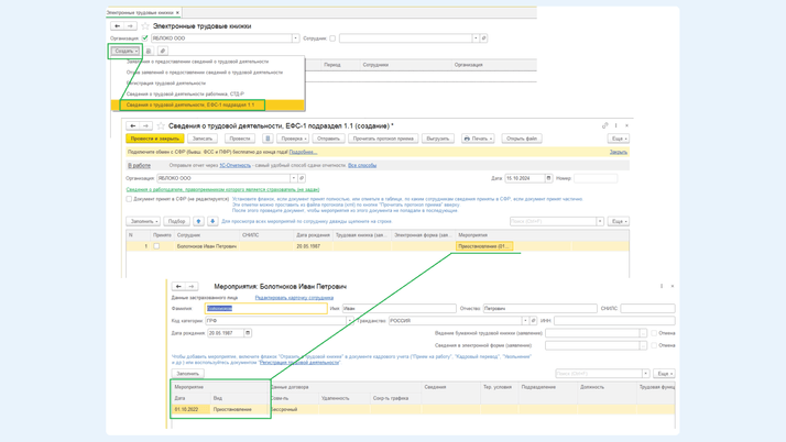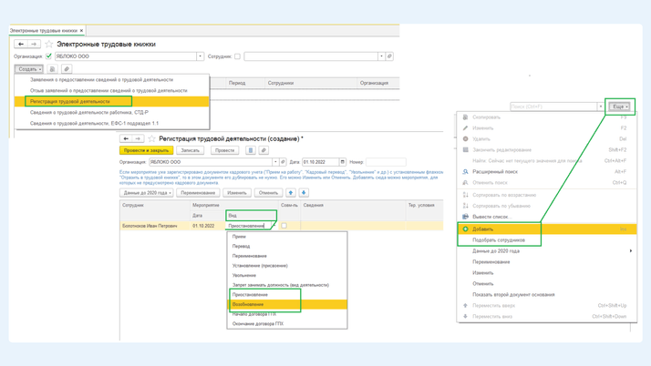 Для отражения в отчете ЕФС-1 подраздел 1.1 приостановления или возобновления трудового договора необходимо создать регистрацию трудовой деятельности («Зарплата и кадры» – «Электронные трудовые книжки» – «Создать»), по кнопке «Еще» добавить сотрудника и указать мероприятие «Приостановление»/«Возобновление» вручную.