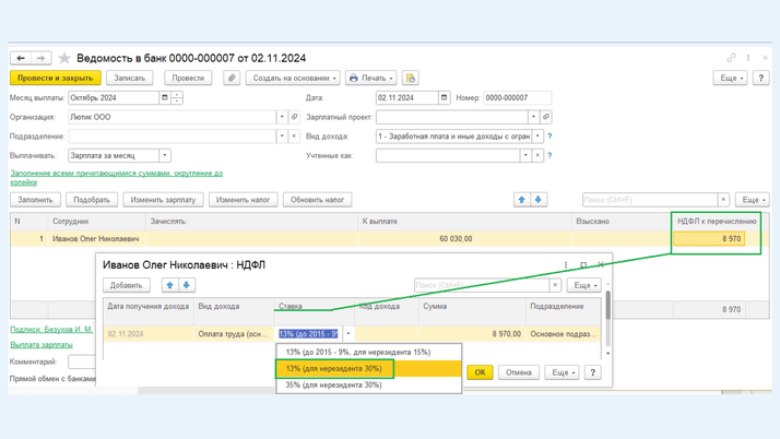 По расшифровке суммы удержанного НДФЛ можно определить документ-основание, в котором допущена ошибка, и в нем исправить ставку налога на верную ‒ 13 % (для нерезидента 30 %).