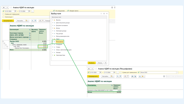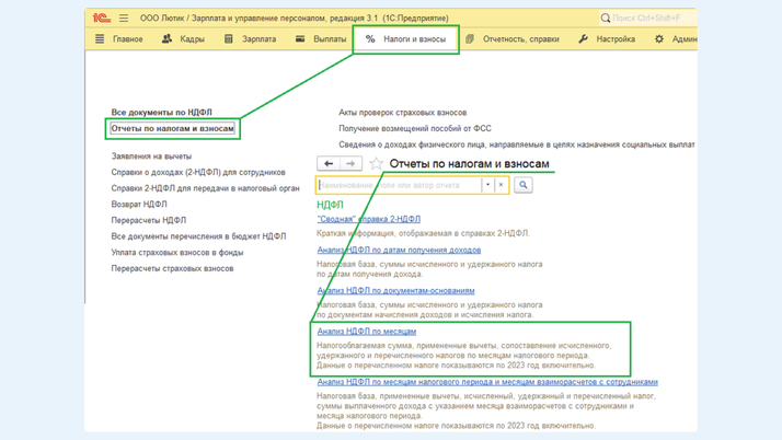Для того чтобы проверить заполнение 6-НДФЛ, формируем отчет «Анализ НДФЛ по месяцам» в разделе «Налоги и взносы» ‒ «Отчеты по налогам и взносам».