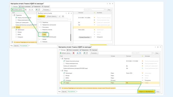 Переходим в настройки отчета, вид настроек «Расширенный». По кнопке «Добавить фильтр» устанавливаем отбор по ставке 9 %. Нажимаем «Закрыть и сформировать».