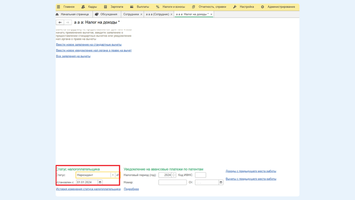 Чтобы изменить статус налогоплательщика, заходим в раздел «Кадры» – «Сотрудники». В карточке сотрудника переходим в раздел «Налог на доходы» – поле «Статус налогоплательщика».