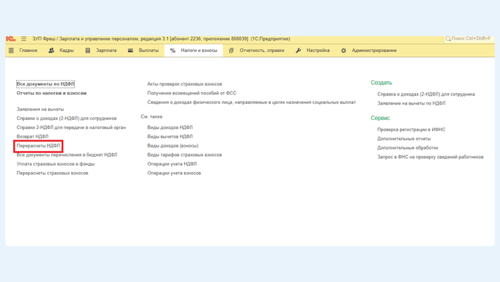 Чтобы пересчитать НДФЛ с начала года, воспользуемся документом «Перерасчет НДФЛ» в разделе «Налоги и взносы».