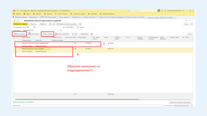 Чтобы убрать из штатного расписания позиции, которые не относятся к районным коэффициентам, нужно будет зайти в раздел «Кадры» — «Штатное расписание» — «Документы изменившие штатное расписание» — закрыть позиции и создать новые, переведя в подразделение, где нет районного коэффициента.