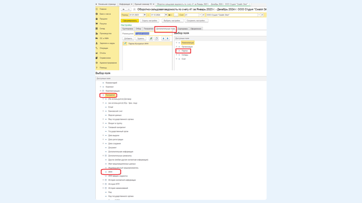 После выполнения настроек на вкладке «Дополнительные поля» отобразится «Партии. Контрагент. ИНН».