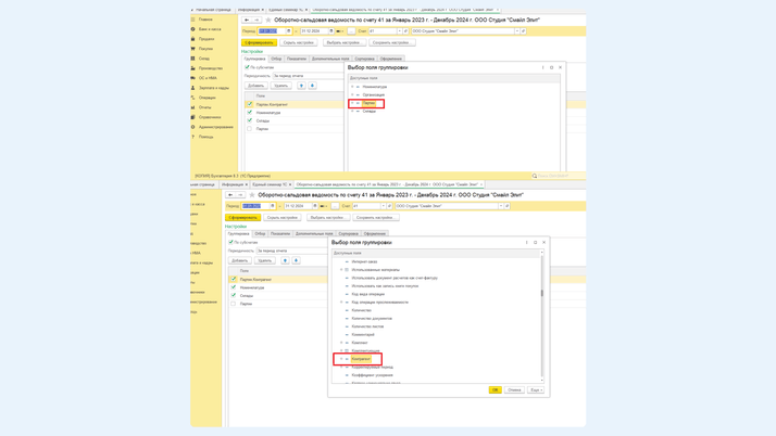 После настроек на вкладке «Группировка» в графе «Поле» отобразится «Партии. Контрагент».