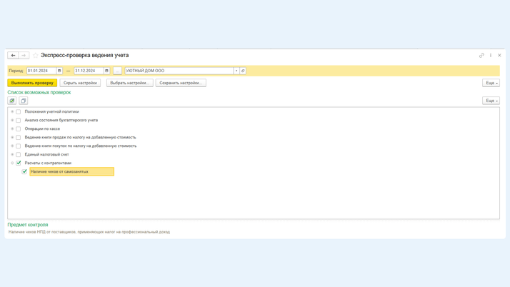 Наличие чеков от самозанятых по оформленным с ними актам и накладным можно проверить и в ходе экспресс-проверки ведения учета (раздел «Отчеты» – «Анализ учета» – «Экспресс-проверка»). Для этого следует перейти в настройки отчета и в списке возможных проверок установить флаг «Наличие чеков от самозанятых» (группа «Расчеты с контрагентами»).