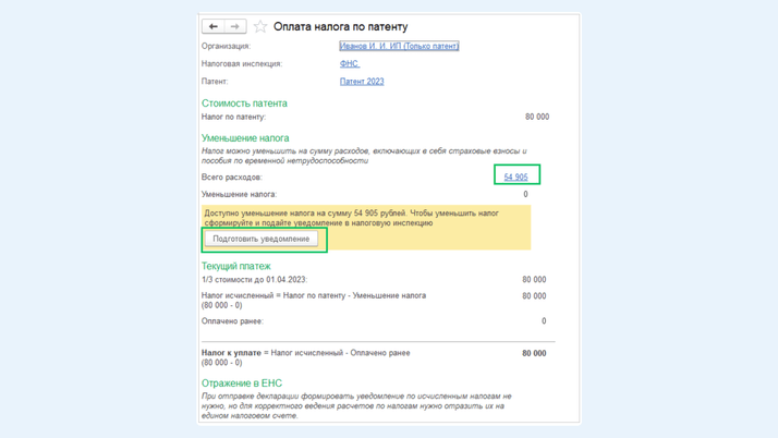 Из раздела «Задач организации» нужно перейти в помощник «Оплата налога по патенту», где в поле «Всего расходов» можно, кликнув мышкой по сумме, проверить расшифровку. Ниже по кнопке «Подготовить уведомление» можно сформировать уведомление на уменьшение стоимости патента.