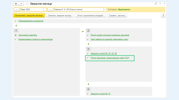 Чтобы в программе 1С:Бухгалтерия предприятия ред. 3.0 сформировать уведомление об уменьшении стоимости патента на страховые взносы, необходимо выполнить закрытие месяца («Операции» – «Закрытие месяца»). Также необходимо провести сверку с ФНС, проследить распределение ЕНП на уплату страховых взносов в каждом месяце отчетного периода. Расчет расходов, уменьшающих налог ПСН, производится регламентной одноименной операцией в закрытии последнего месяца квартала.