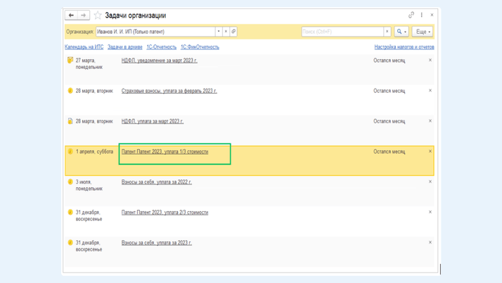 Подготовить уведомление об уменьшении стоимости патента на страховые взносы можно в разделе «Главное» – «Задачи организации».