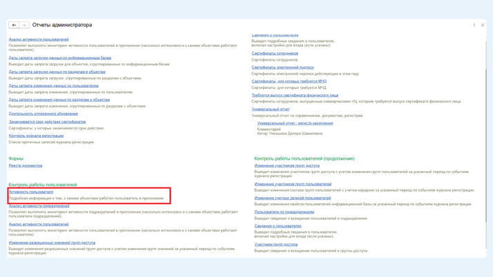 Для анализа активности работы пользователя с документами может быть использован отчет «Активность пользователя».