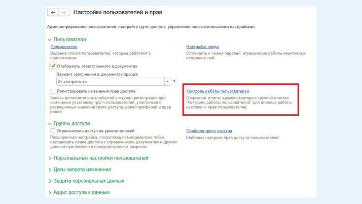 Для того чтобы узнать, какие документы создавал или менял пользователь, необходимо выполнить следующие действия: раздел «Администрирование» – «Настройки пользователей и прав» – «Контроль работы пользователей».
