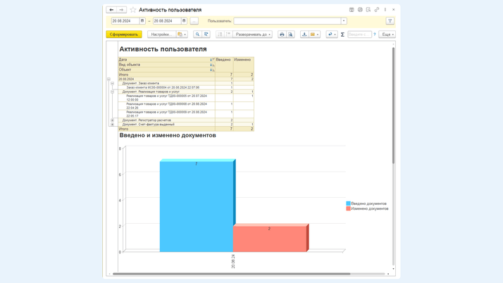 В отчете будут указаны созданные и измененные документы и справочники. В колонке «Изменено» указано, сколько раз пользователь менял документ. Информация представлена в текстовом и графическом виде.