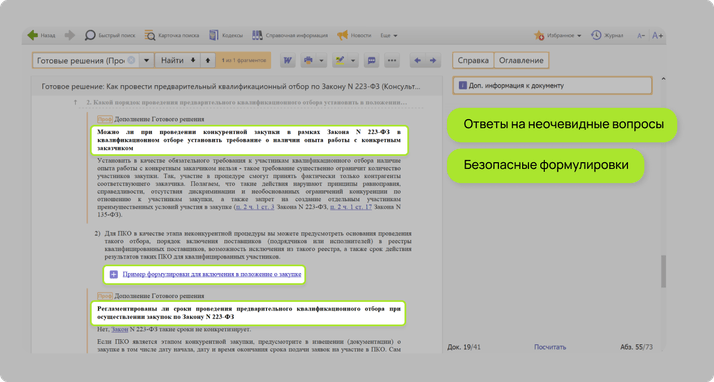 Это вставки с ответами на неочевидные вопросы и подводными камнями, о которых вы можете не догадываться. Также можно сразу забрать в работу выверенные формулировки и образцы, к которым не будет претензий со стороны ФАС.