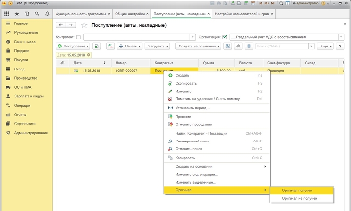 В журнале документов, выделить документ, не заходя в него. Нажать правую кнопку мыши или кнопку Еще/Оригинал/Получен.