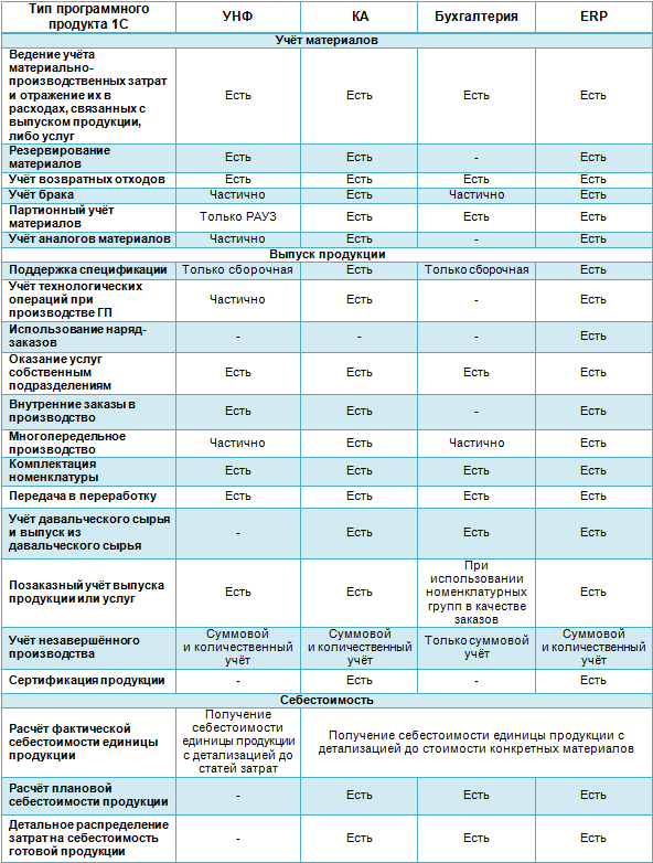 Сравнительная таблица возможностей производственных блоков различных решений 1С