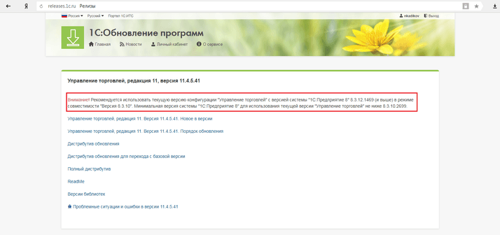 Скачиваем и устанавливаем подходящую для вашей конфигурации платформу. Посмотреть, какая платформа подходит конфигурации, можно на том же сайте обновлений. Переходите по ссылке, которая названа именем вашей конфигурации, далее нажимаете на тот релиз, который установлен на данный момент, и в верхней части окна увидите информацию по платформе на этом релизе.