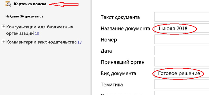 Откройте карточку поиска, в поле «Название документа» введите дату «1 июля 2018», в поле «Вид документа» — «Готовое решение».