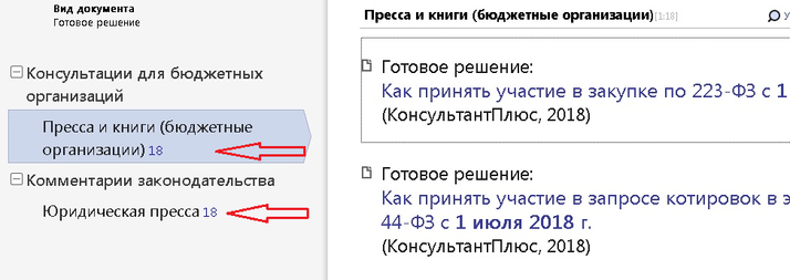 Дайте команду на поиск. Обратите внимание, искомые готовые решения находятся в двух информационных банках: «Пресса и книги (бюджетные организации)» и «Юридическая пресса».