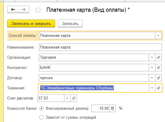 Поле «Вид оплаты» заполняется из справочника «Виды оплат». Элемент справочника отражает данные для заполнения счёта расчётов с банком: самого банка-эквайера, договора эквайринга с банком, а также информацию о комиссии банка. Пример заполнения справочника представлен на рис.3.