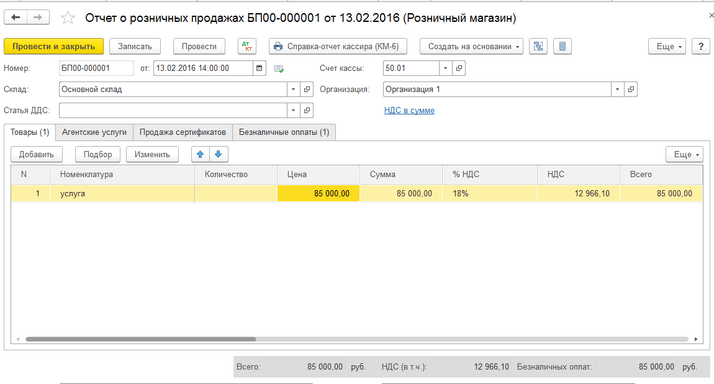 Если учёт товаров ведётся автоматизированно по ценам приобретения, то для учёта розничной выручки, которая была получена посредством использования пластиковых карт, используется документ «Отчёт о розничных продажах» с видом операции «Розничный магазин» (при этом заполняются обе закладки: «Товары» и «Безналичные оплаты») (рис.4).
