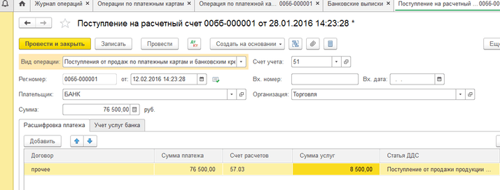 Информация о произведённых платежах поступает в банк, обслуживающий данный терминал. Банк перечисляет денежные средства на расчётный счёт нашего предприятия. На основании полученной банковской выписки необходимо ввести данные в документ «Поступление на расчётный счёт» с видом операции «Поступление от продаж по платёжным картам и банковским кредитам», в котором также можно учесть комиссию банка-эквайрера. После выбора операции нужно заполнить закладки: